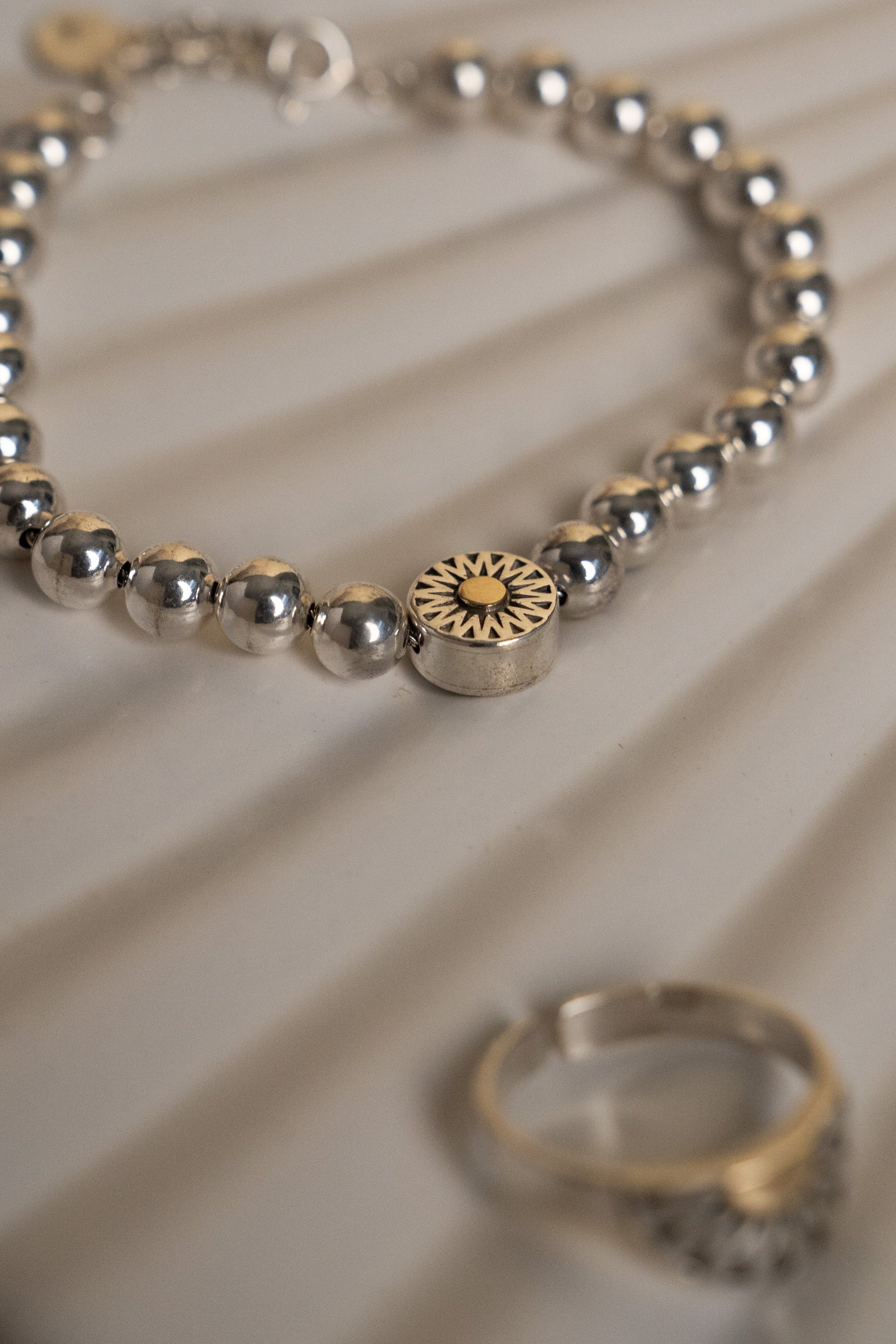 Comprised of hollow silver beads with the designers signature Sun pattern bead in the centre, this eye catching bracelet sits comfortably on the wrist. Striking worn on it's own but also great for layering, it is a versatile and elegant piece crafted to a high standard.