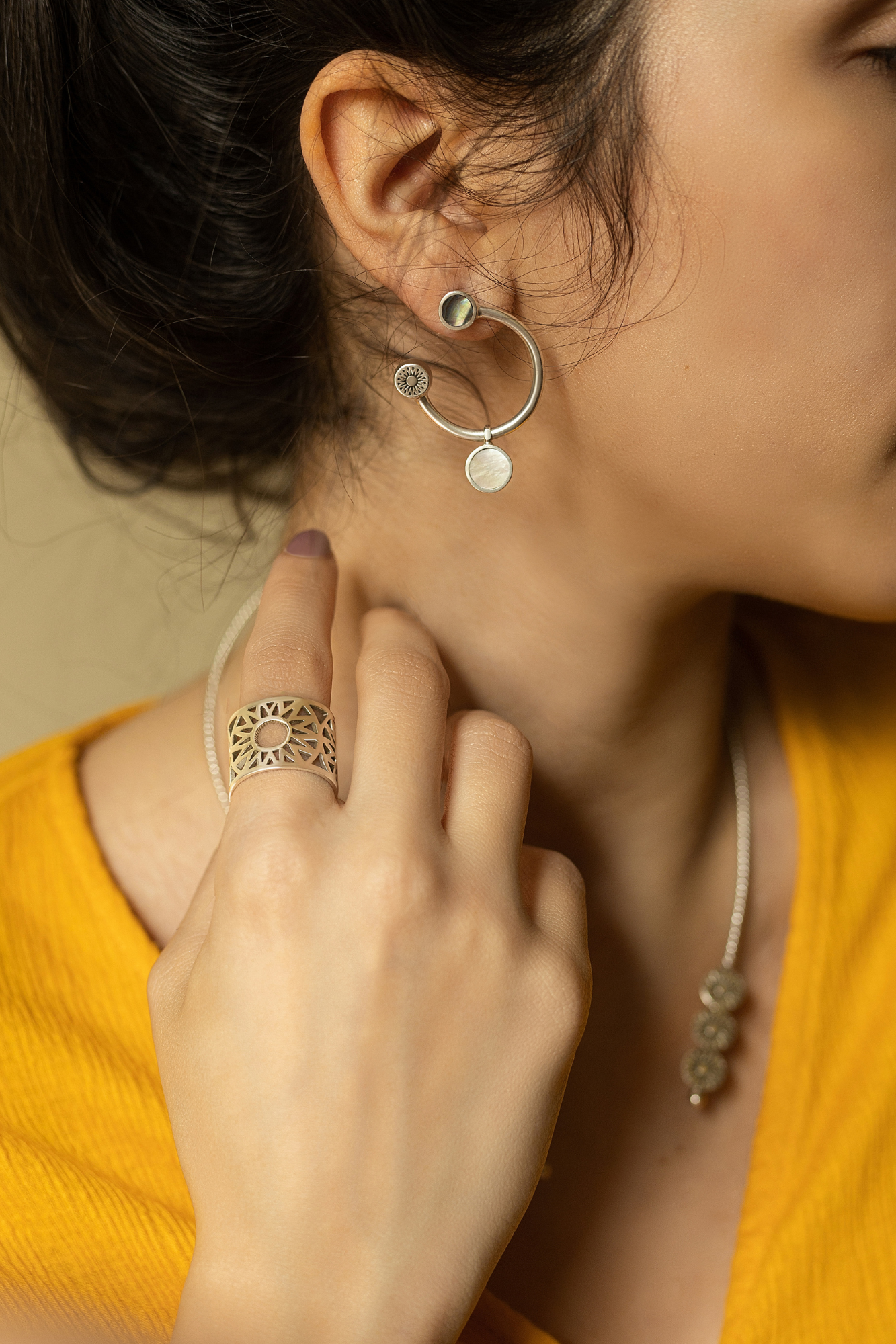 Mother of Pearl has long been associated with the divine feminine energy, and believed to bring the wearer calm, balance and emotional clarity. Combined with the designer's signature sun pattern, this piece is both visually striking and a deeply meaningful symbol of the wearer's femininity and new beginnings.